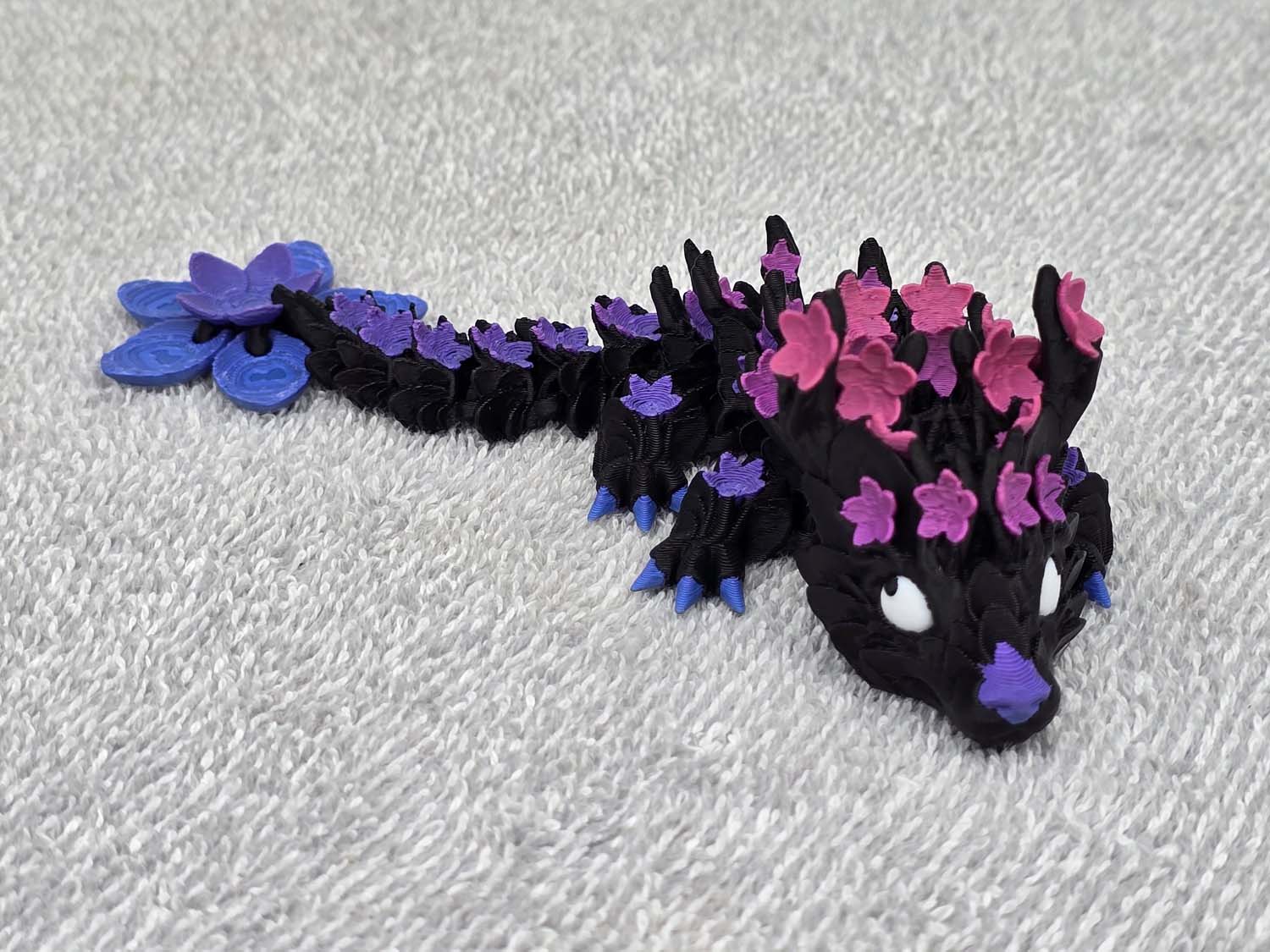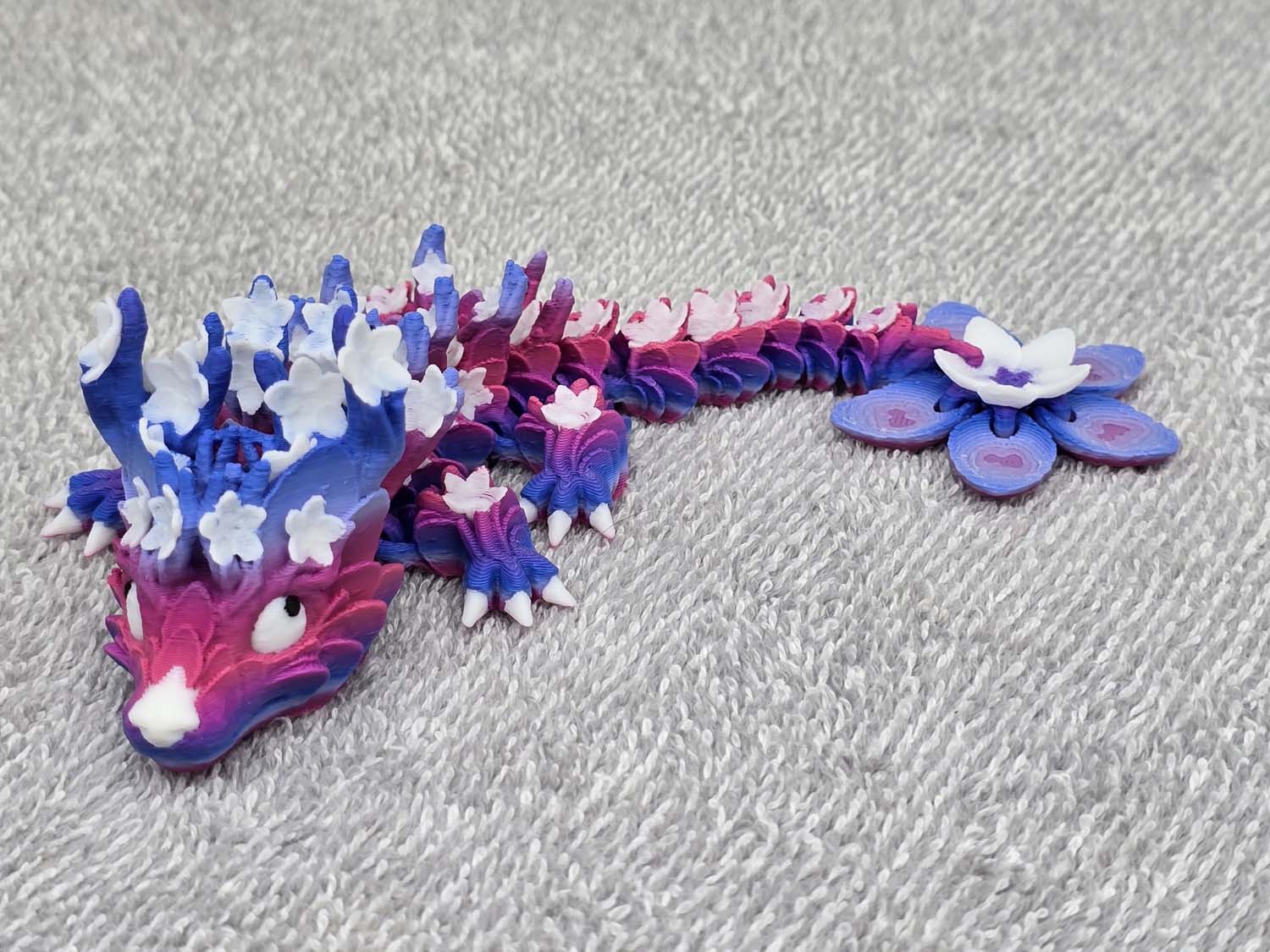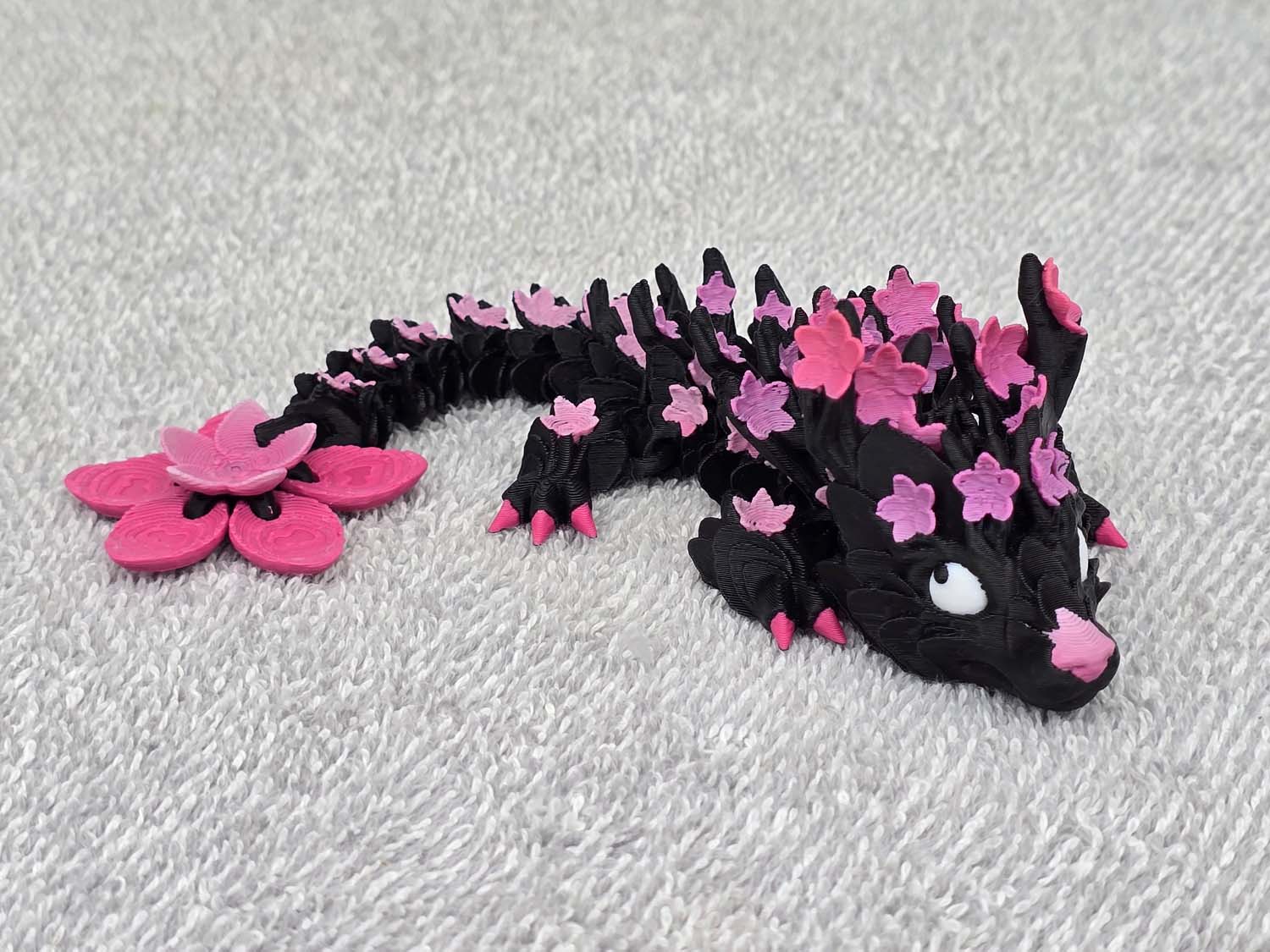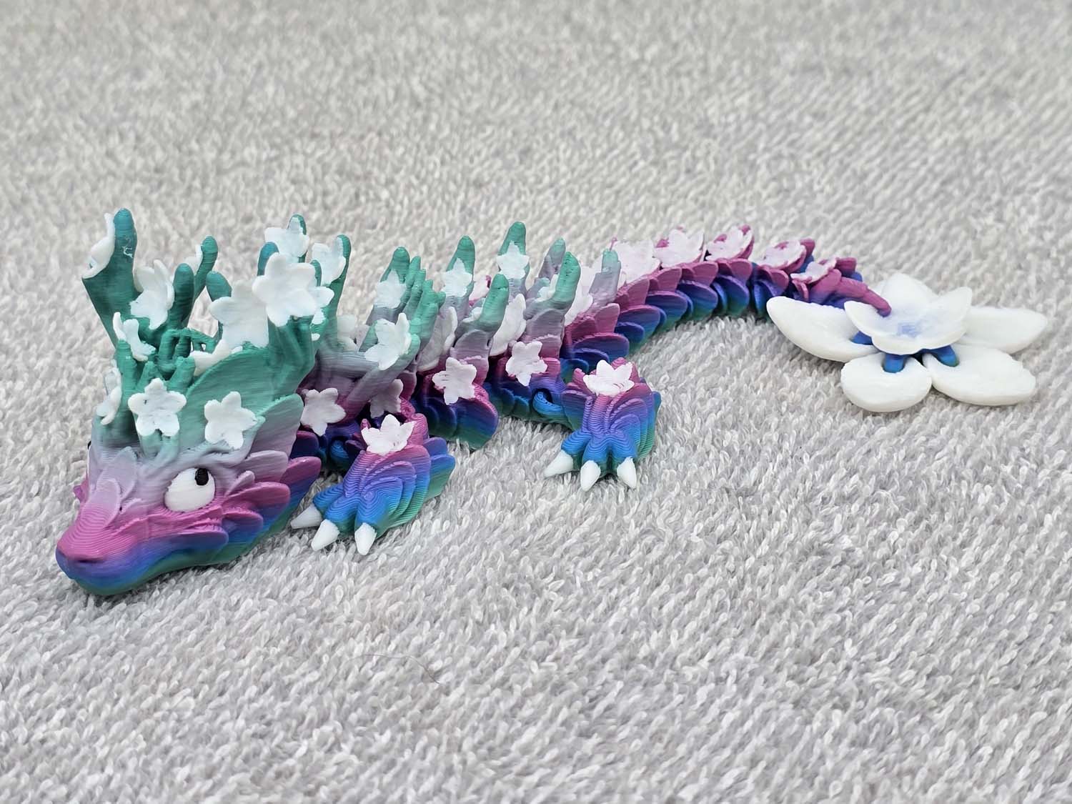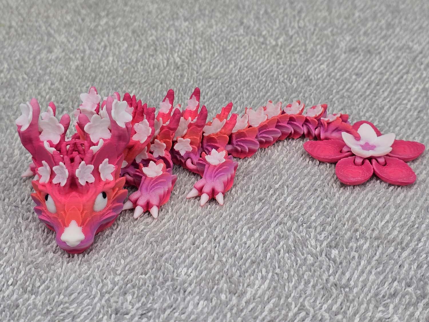 The dragon features Cherry Blossoms adorning the antlers on the head and down the entire body. The tail ends with a large Cherry Blossom to top it off.