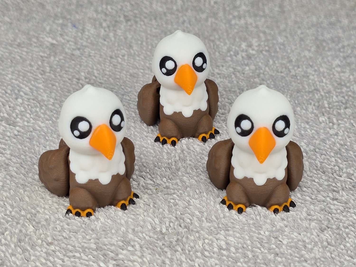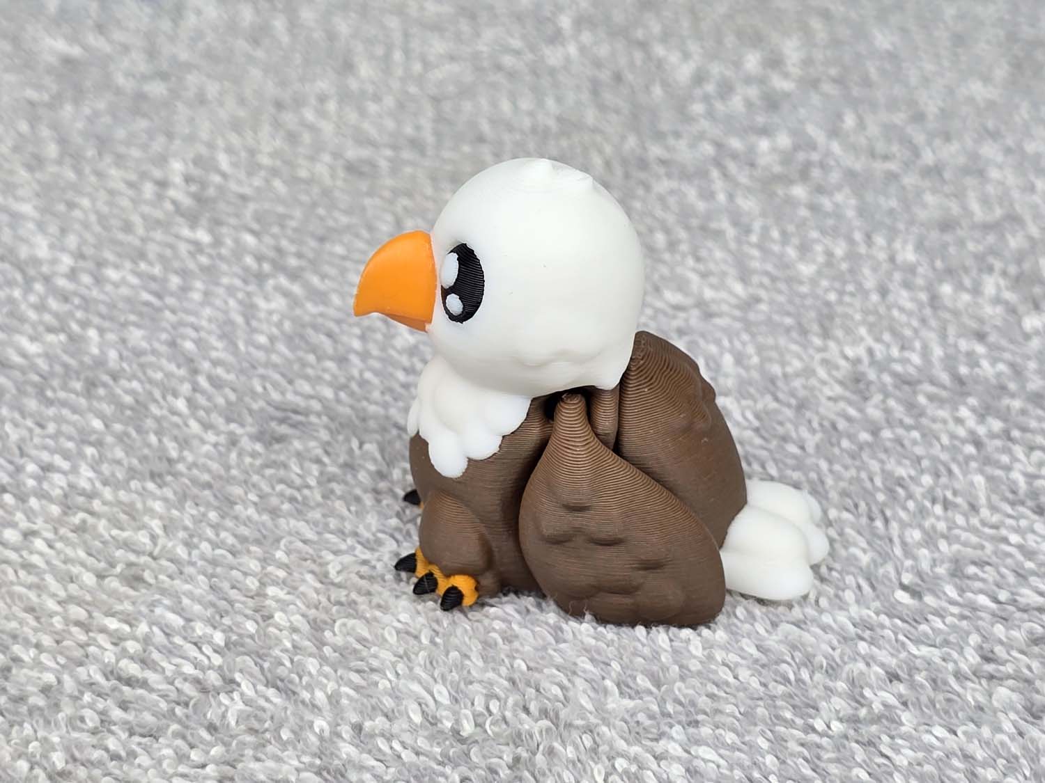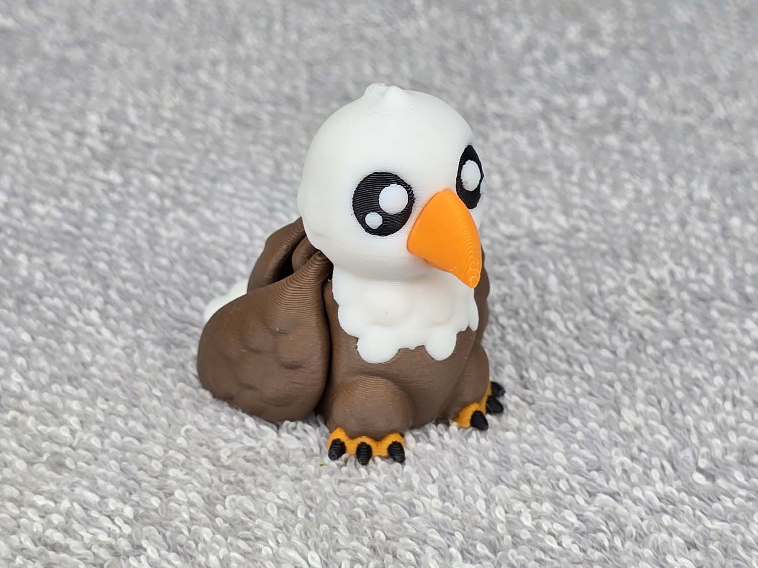 Head can rotate 360 degrees, wings and tail articulates.  Fits in the palm of your hand.