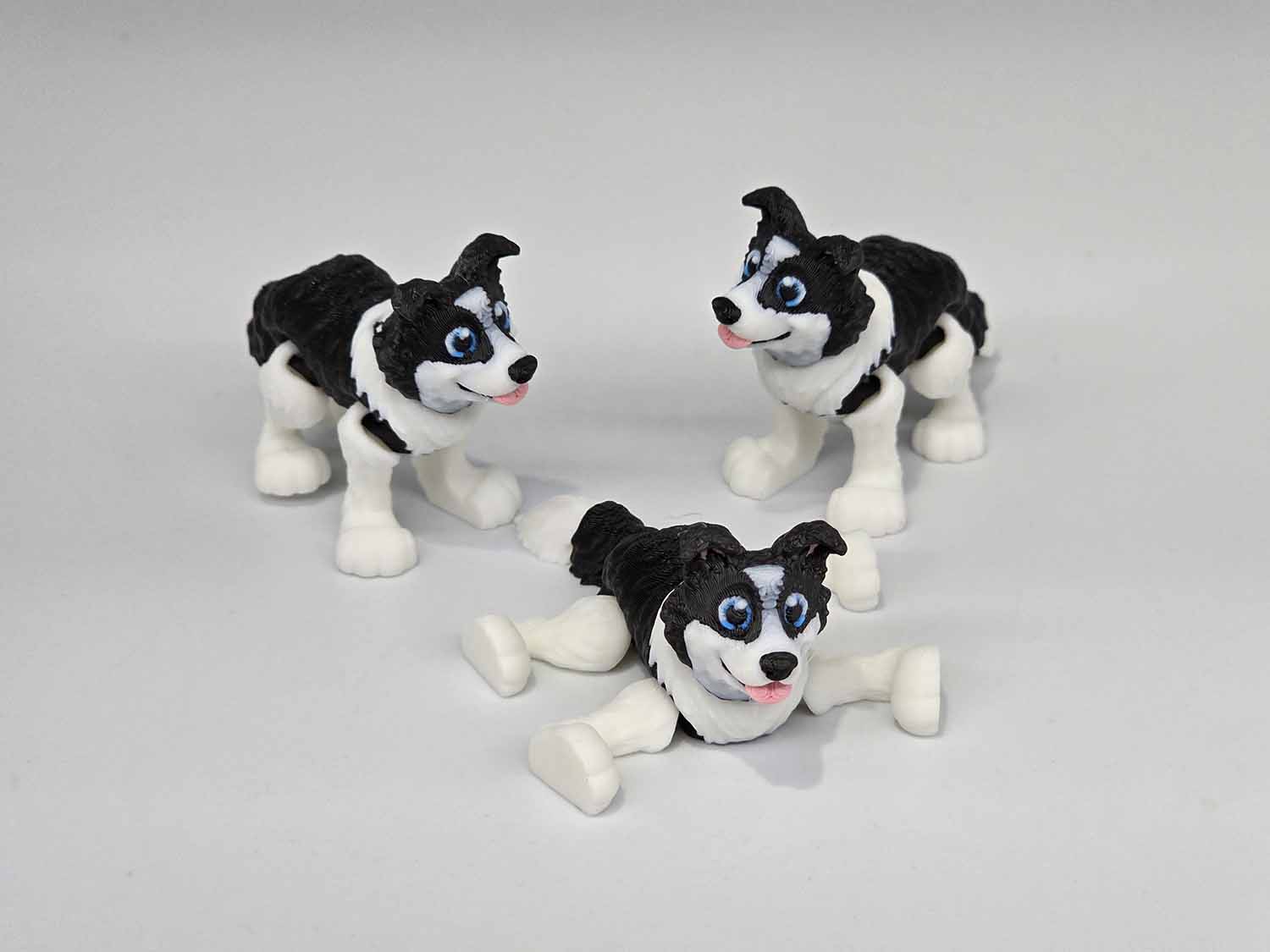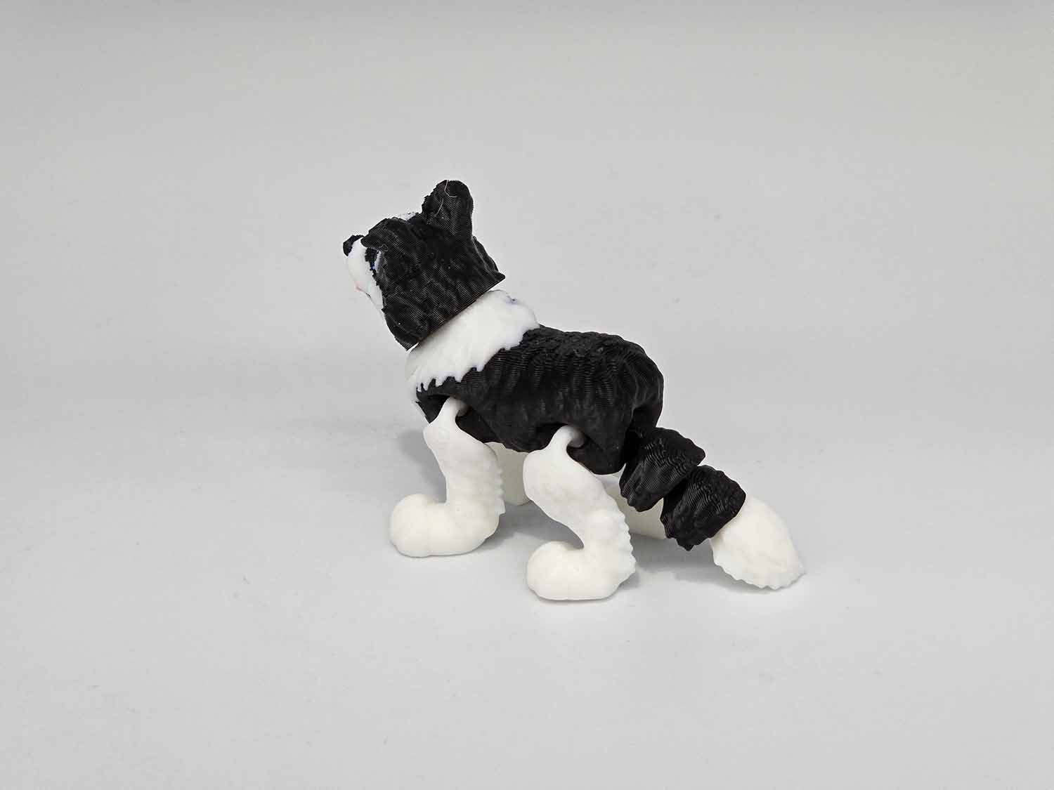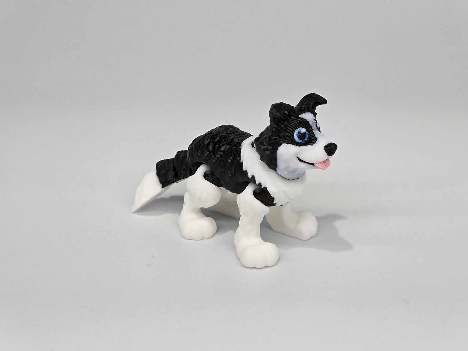 Articulates 4 legs, the tail and the head turns 360 degrees. Comes in color as shown.