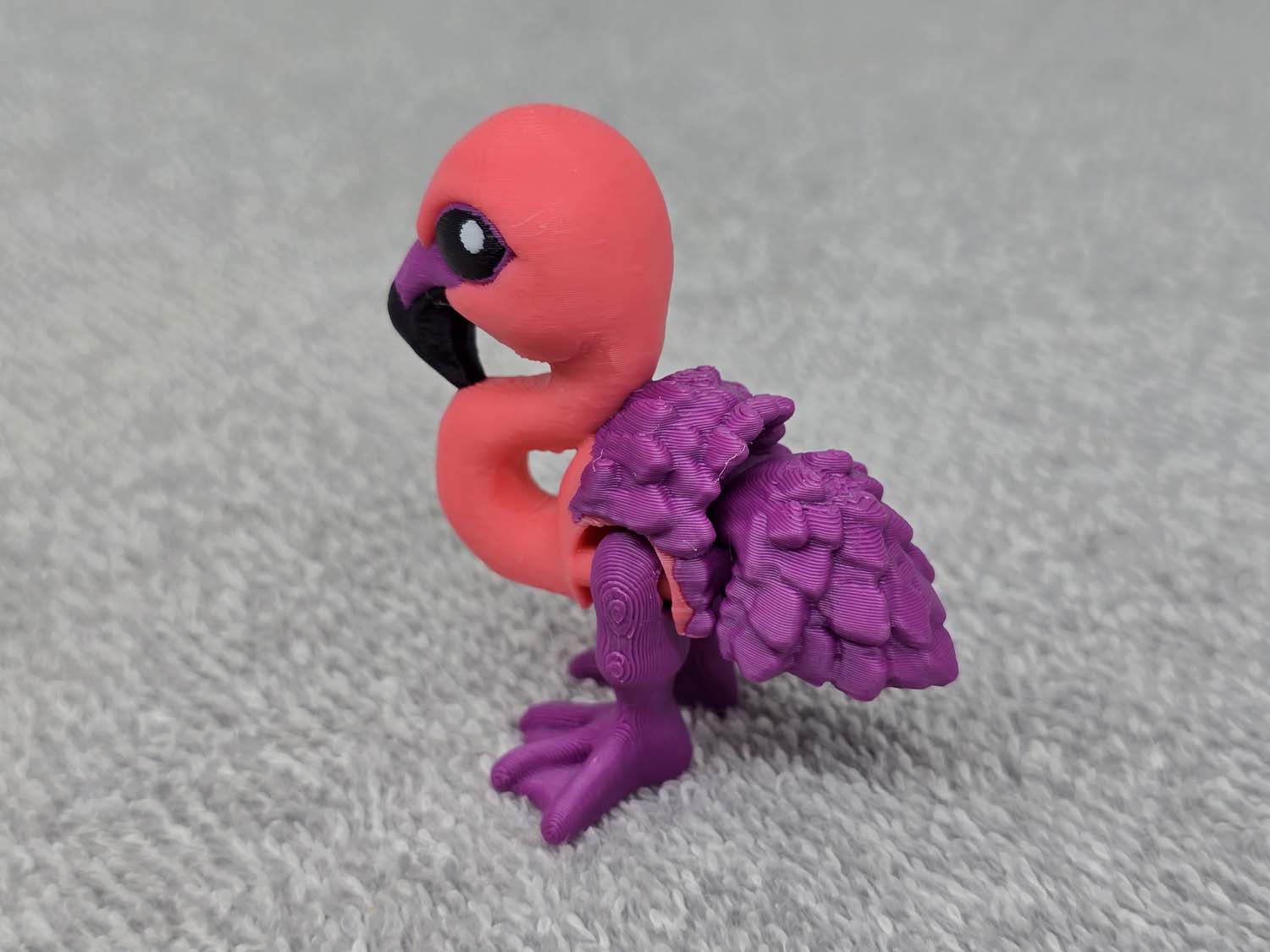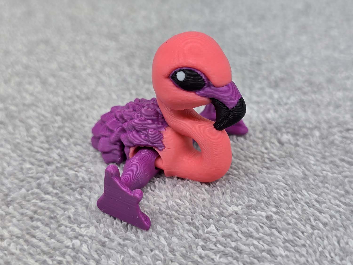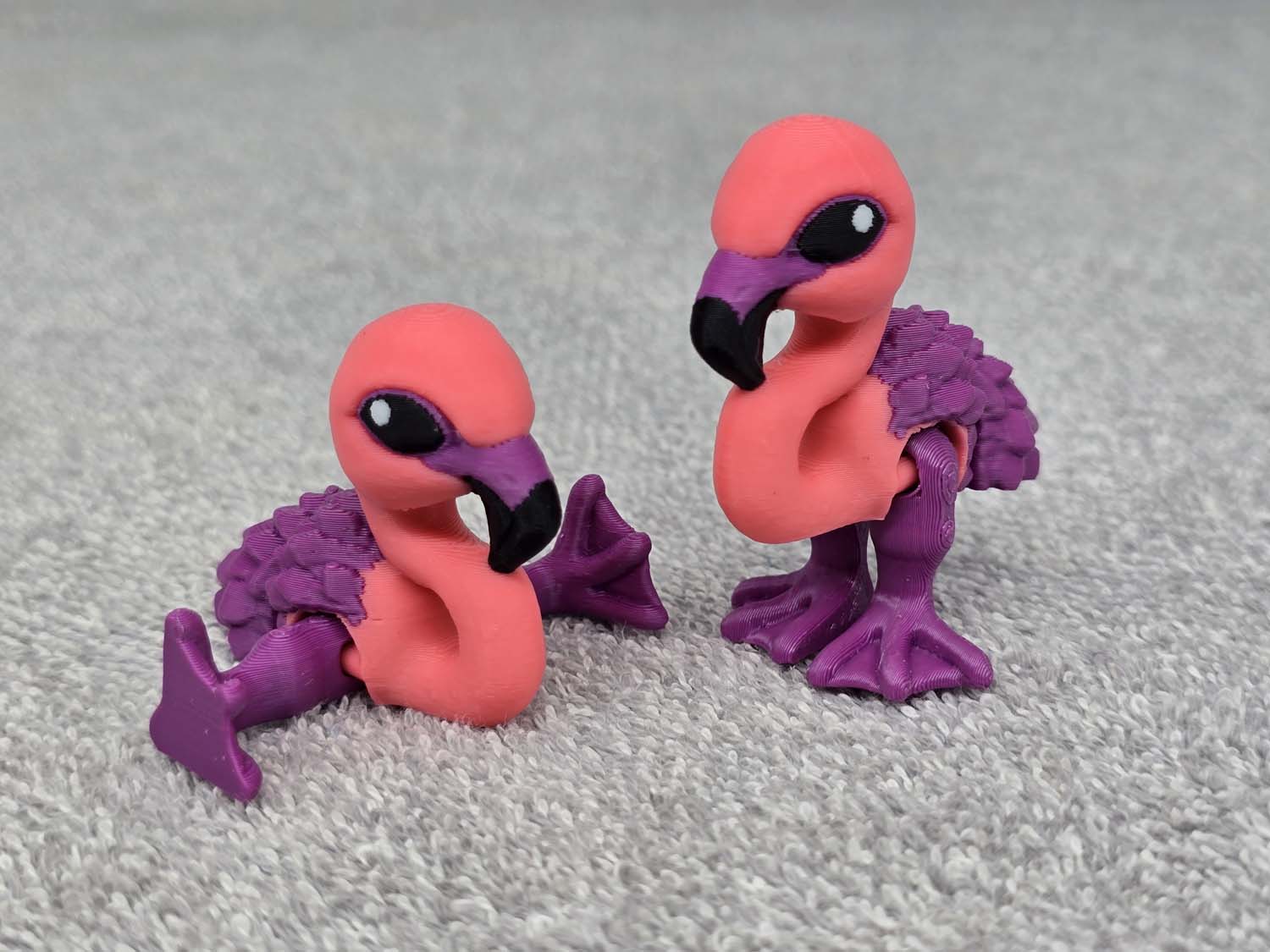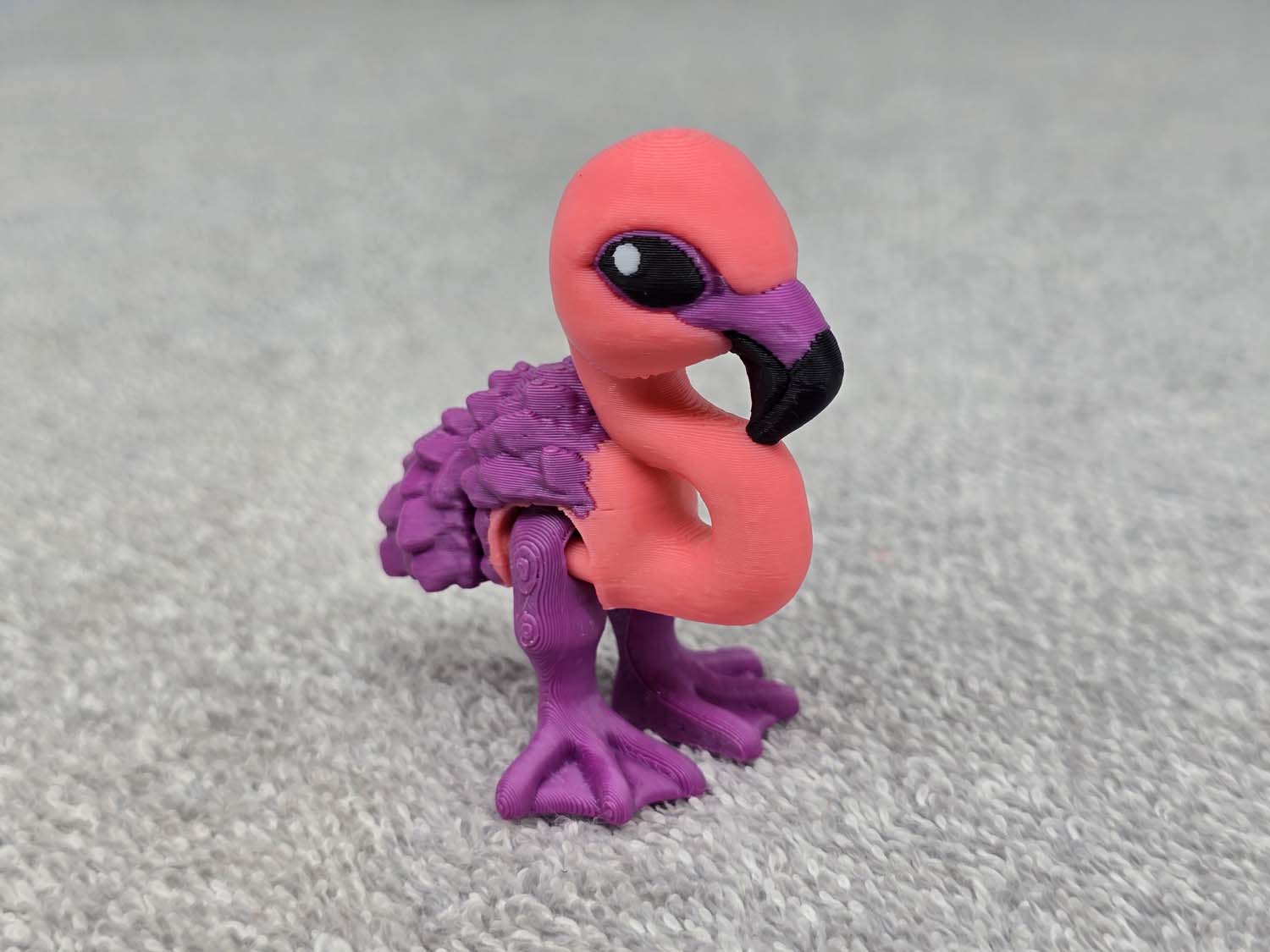 Here we have a super fun colored flamingo. Sturdy and both legs articulate. Can pose sitting or standing. Fits in the palm of your hand.