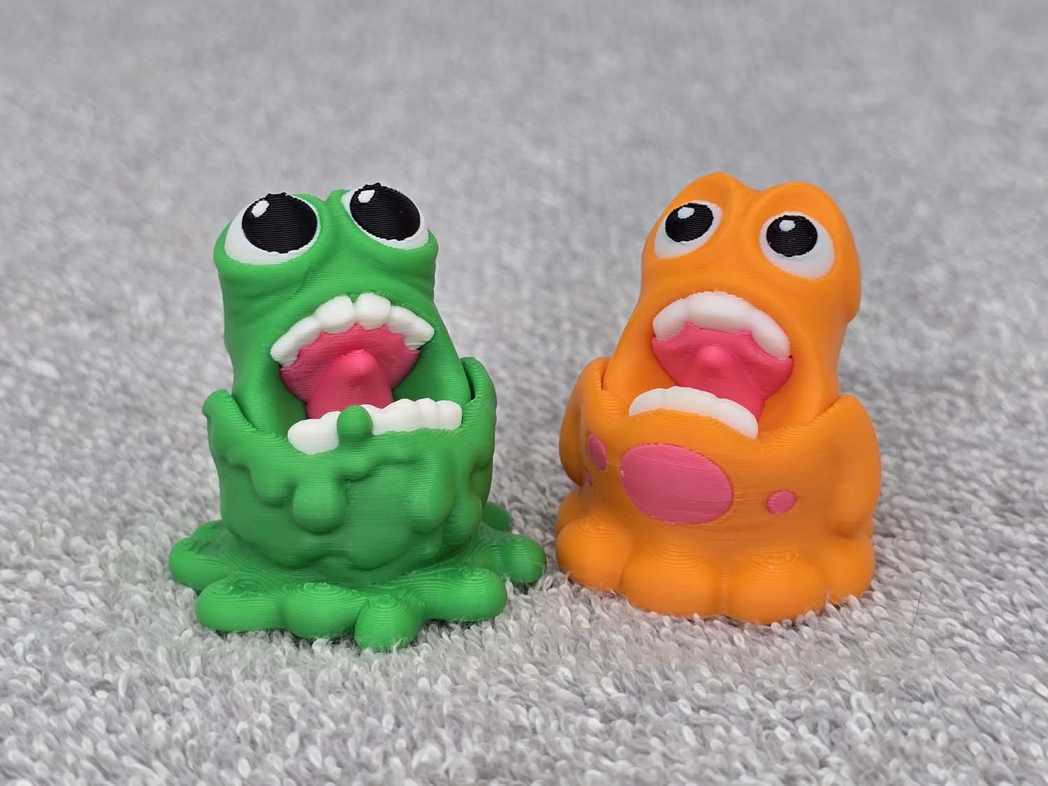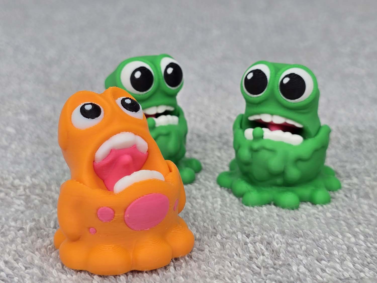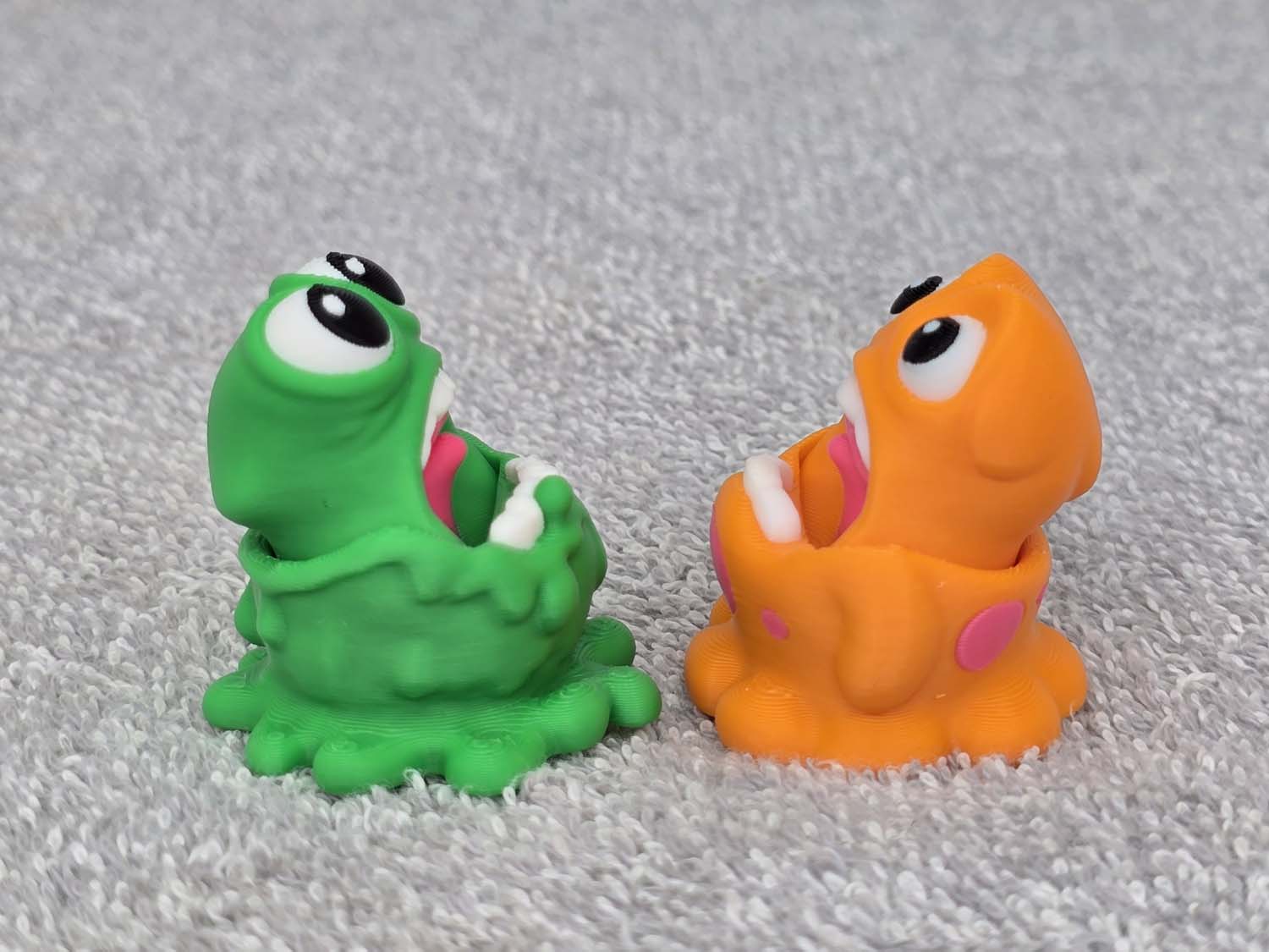 Introducing the Slime Monster little.  The mouths are on a hinge and do a chomp up and down motion when played with.  Fits in the palm of your hand.  Comes in Green or Orange.